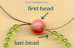 Cut a 36 inch strand of bead cord and tie a knot at one end. You may have to tie a second knot around the first to form a large enough knot to keep the beads from falling off while you are stringing them. Coat the other end of the cord with super glue to form a needle so that it will be easier to string the beads. String the beads in this order: 1 Large Bead, 6 Small Beads, 1 Medium Bead, 6 Small Beads |